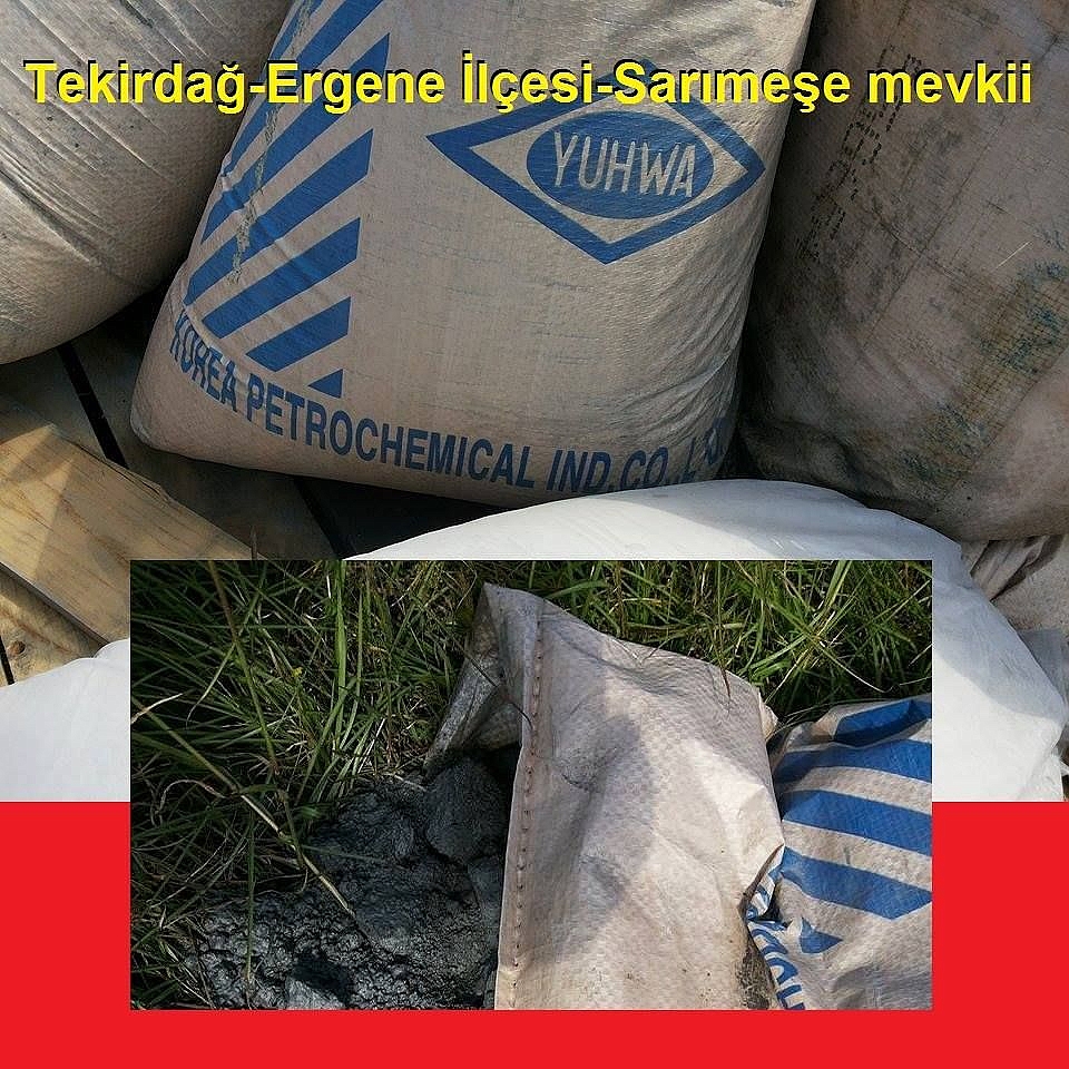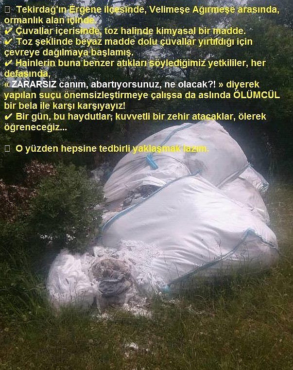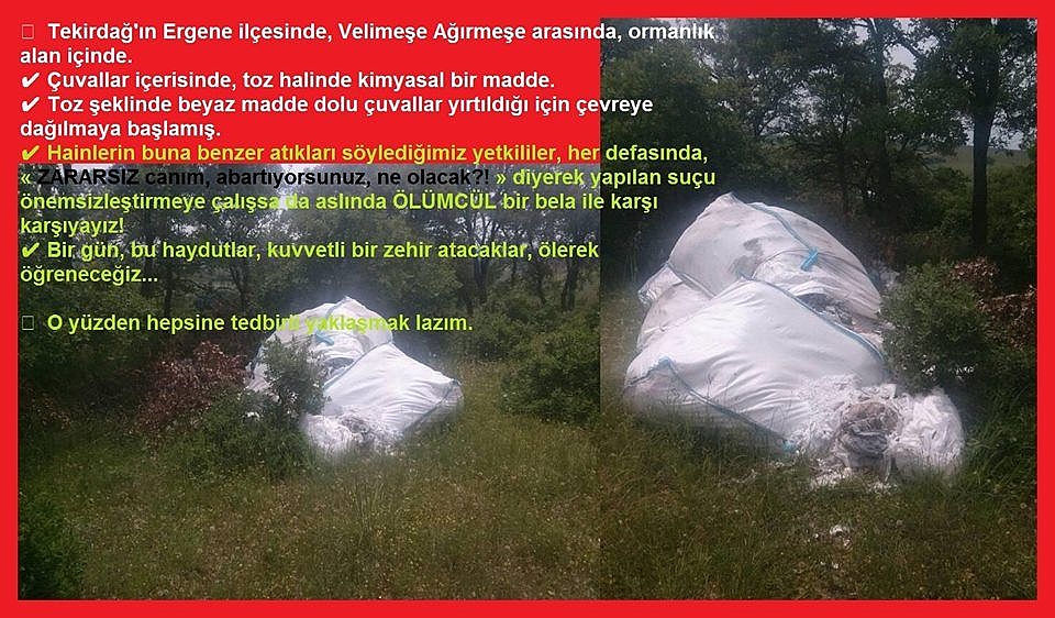 Tekirdağ'ın Ergene ilçesinde, VelimeşeAğırmeşe arasında, ormanlık alan içinde.Çuvallar içerisinde, toz halinde kimyasal bir madde. Toz şeklinde beyaz madde dolu çuvallar yırtıldığı için çevreye dağılmaya başlamış. Hainlerin buna benzer atıkları söylediğimiz yetkililer, her defasında,“ZARARSIZ canım, abartıyorsunuz, ne olacak?!» diyerek yapılan suçu önemsizleştirmeye çalışsa da aslında ÖLÜMCÜL bir bela ile karşı karşıyayız.