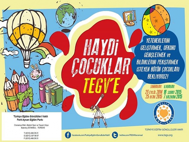 20. yaşını kutlamaya hazırlanan, Türkiye’nin eğitim alanında faaliyet gösteren en yaygın sivil toplum kuruluşu Türkiye Eğitim Gönüllüleri Vakfı, ilköğretim çağındaki çocuklarımızın, güzel bir çocukluk geçirmeleri ve geleceğe donanımlı hazırlanmaları için, yaşam becerilerini geliştirecek ve temel eğitimlerine destek verecek çağdaş eğitim olanakları sunuyor. TEGV’in 2014-2015 Etkinlik Yılı 29 Eylül Pazartesi günü başlıyor.