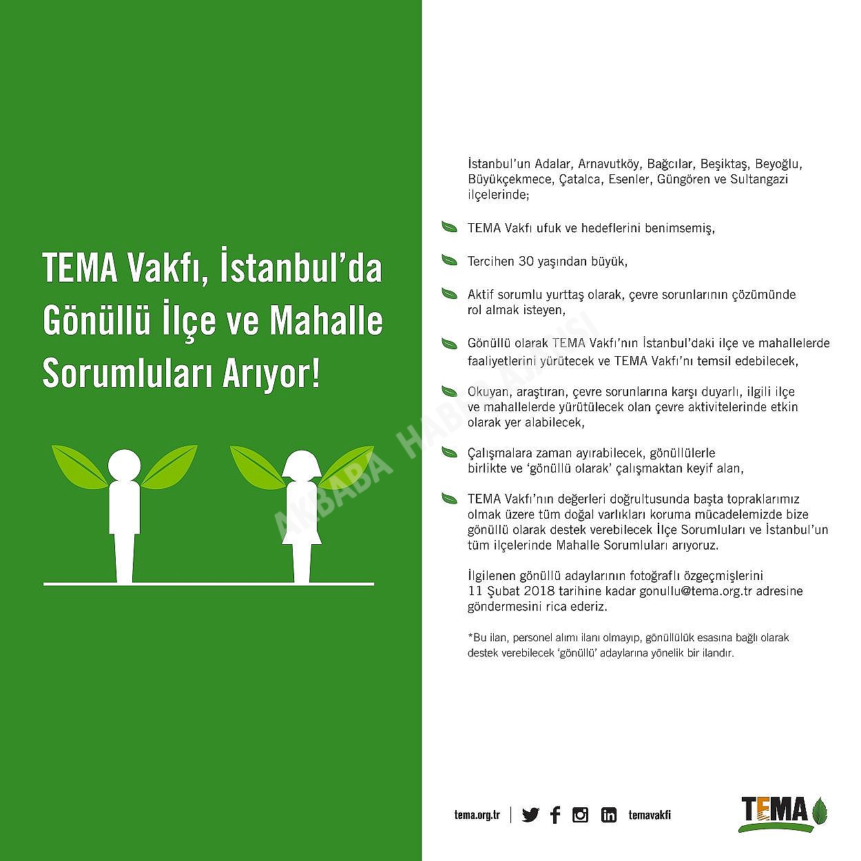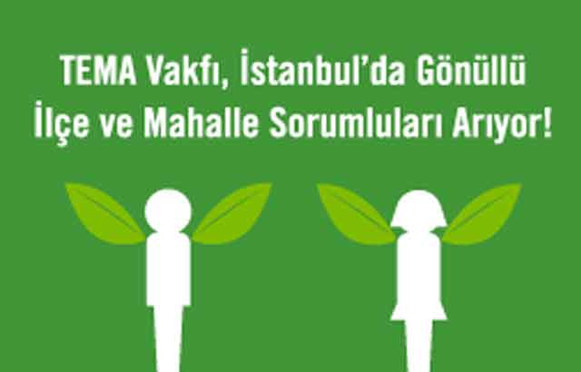 TEMA Vakfı, İstanbul'un Adalar, Arnavutköy, Bağcılar, Beşiktaş, Beyoğlu, Büyükçekmece, Çatalca, Esenler, Güngören ve Sultangazi ilçelerinde gönüllü olarak, görev alacak sorumlu arıyor. Tema Vakfı'ndan yapılan yazılı açıklamada;