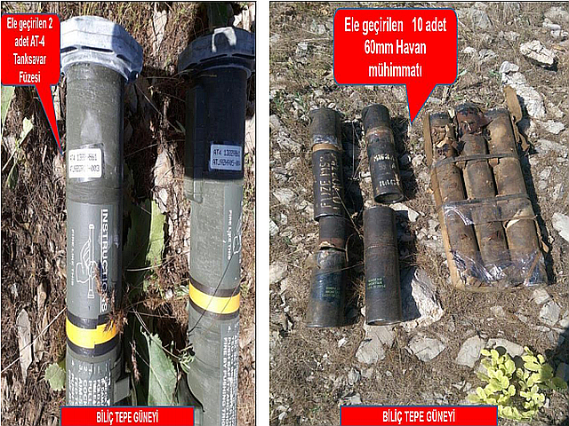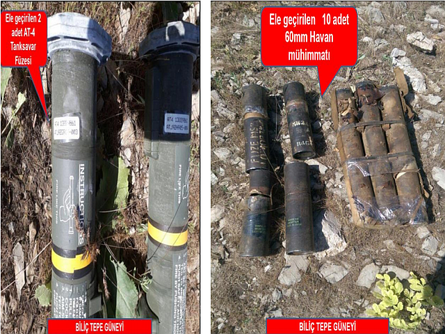 Güvenlik güçlerinin yürüttüğü operasyonlar neticesinde ise Pkk terör örgütüne ait çok sayıda mühimmat ele geçirildi.23'ü ağır silah olmak üzere (2 adet Güdümlü Füze , 6 Roketatar, 1 Kanas, 6 Bixi, 8 Kalaşnikov) toplam 27 adet silah, 2.5 Ton patlayıcı yapımında kullanılan madde, 32 El Bombası, 3.200 adet muhtelif mühimmat ele geçirilmiş, Tuzaklanan 11 el yapımı patlayıcı/mayın imha edilmiş, Teröristler tarafından kullanılan, 8 ilde 11 sığınak / barınak / mağara kullanılamaz hale getirildi.