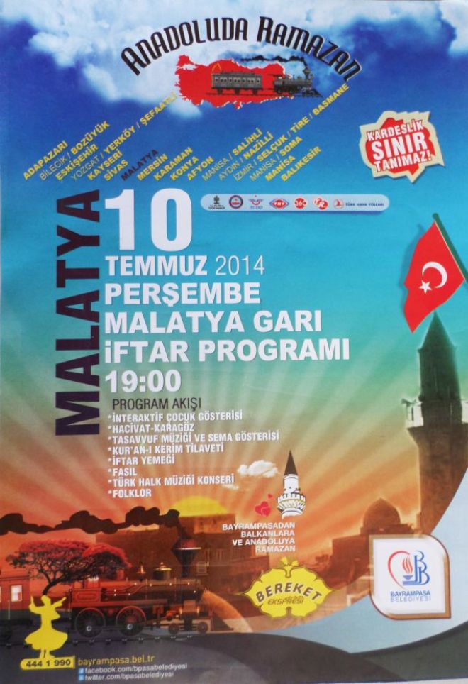 Bu kapsamda Malatya Büyükşehir Belediyesi işbirliğinde Malatya Garında iftar programı düzenlenecek. 10 Temmuz Perşembe Günü saat 19.00’da başlayacak iftar programı kapsamında interaktif çocuk gösterileri, Hacivat-Karagöz, Tasavvuf Müziği ve Sema Gösterisi ile Kur’an-ı Kerim Tilaveti yer alıyor. İftar saatinde iftar yapılmasının ardından da program çeşitli gösterilerle devam edecek.