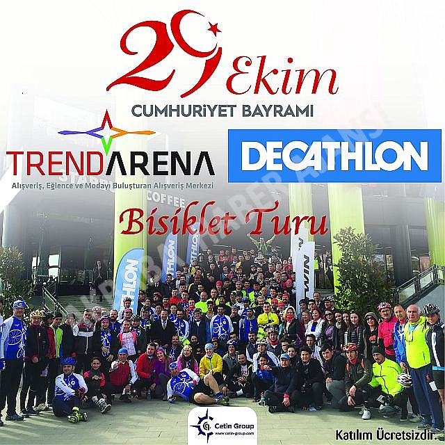 Trend Arena Avm Giriş katında ikramlar eşliğinde ağırlanacak bisikletçiler dinlenmenin ardından soluğu çekiliş için 1. Kat etkinlik alanında alacak. Çekilişte bisikletçilere hometrainerler,bisikletler,sırt çantaları,kasklar,mataralar ve sürpriz hediyeler verilecek. 2. kat etkinlik alanında ise gün boyu ücretsiz Decathlon spor etkinlikleri trambolin, masa tenisi, mini futbol, ok atma, dart, paten-kaykay spor aktiviteleri de ziyaretçilerle buluşuyor olacak. Yine 29 Ekim Cumhuriyet Bayramı etkinlikleri kapsamında Cumhuriyet Vals'i ile saat 18.30’da Trend Arena'da görsel şölen başlayacak. Dans şöleni Yetişkin Serbest Dans Gösterisi ve Halk Oyunları ile devam edecek. Kapanış gösterisi Bayrak Temalı Jimnastik ile tamamlanacak. Kat kat etkinlik ve eğlencenin adresi Trend Arena'da 28 – 29 Ekim tarihlerinde Yazar Tuğba Çapan Cabi'nin imza etkinliği ise saat 15.30’da Trend Arena 3. Katta D&R mağazasının önünde gerçekleşecek.