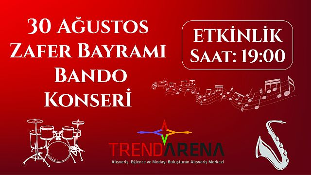 Bu bayramda da yine bir ilki gerçekleştirip, misafirlerine mini Survivor’ı yaşatacak olan Trend Arena, ayrıca Decathlon oyun keşif parkuru ile ücretsiz ve katılım sınırlaması olmaksızın ödüllü yarışmalar düzenlenecek. Parkur içerisinde yer alan ok atma, frizbi, basketbol, çadır kurma, engelli koşunun yanı sıra sürpriz oyunlar da yine Trend Arena ziyaretçilerini bekliyor olacak. 30 Ağustos Coşkusu, dev bando ekibinin seslendireceği şarkılar ve türküler eşliğinde 30 Ağustos Zafer Bayramını Trend Arena, misafirlerine dolu dolu yaşatılacak. 28 kişilik dev kadro’nun saat 19.00’da etkinlik alanında sahne alacağı etkinlikte Zafer Bayramının Coşkusu tüm ziyaretçiler ile Trend Arena’da yaşanacak.