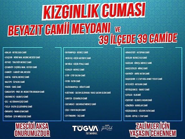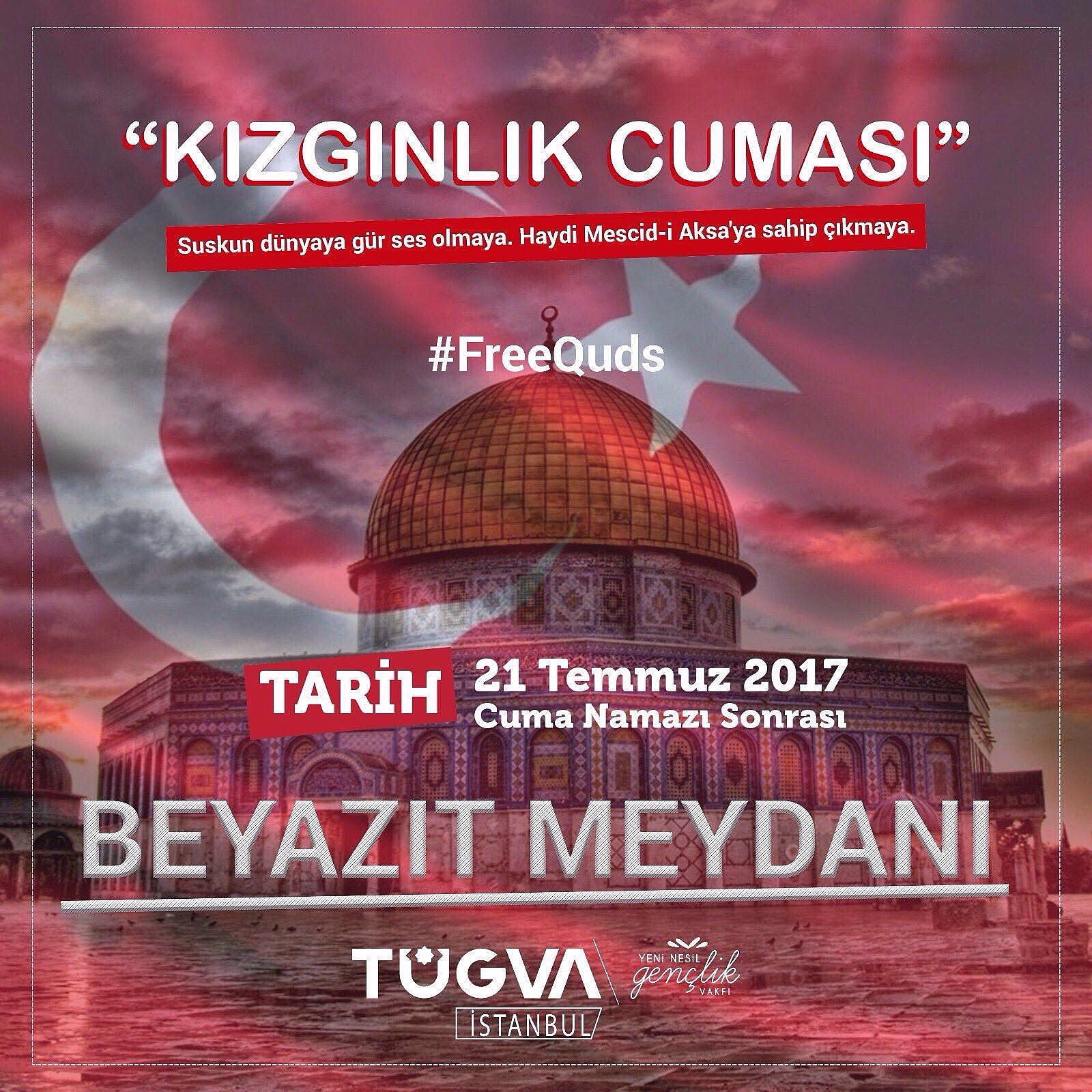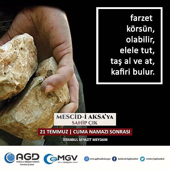 Mescid-i Aksa'da kurulan elektronik dedektör sistemini protesto etmek için yatsı namazını Aslanlı Kapı'da kılan Filistinli cemaate müdahale edildi. Aşırı güç kullanan İsrail polisi camaate ses bombası ve plastik mermilerle saldırdılar. Müdahale sırasında 20'den fazla Filistinli yaralandı. Yapılan bu zulüme sessiz kalmayan Anadolu Gençlik Derneği(AGD), Türkiye Gençlik Vakfı(TÜGVA), Milli Gençlik Vakfı(MGV) tüm müslümanları tepkiye davet ediyor. Binlerce Müslüman Mescid-i Aksa'ya sahip çıkmak adına 21 Temmuz Cuma günü Cuma Namazı sonrası Beyazıt Meydanı'nda buluşarak zulme sessiz kalmayacak. Güngören Tügva Başkanı Abdullah Yılamz yaptığı açıklamasında ''Yarın Cuma çıkışı başta Beyazıt Camii olmak üzere 39 ilçede 39 camide İsrail'i lanetleyip dosta güven düşmana korku salacağız. Herkesi bu kutlu buluşmaya bekliyorum'' ifadelerini kullandı.