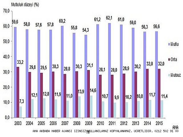 Mutlu olduğunu beyan eden bireylerin oranı 2014 yılında %56,3 iken 2015 yılında %56,6 oldu. Mutsuz olduğunu beyan eden bireylerin oranı ise %11,7’den %11,4’e düştü.