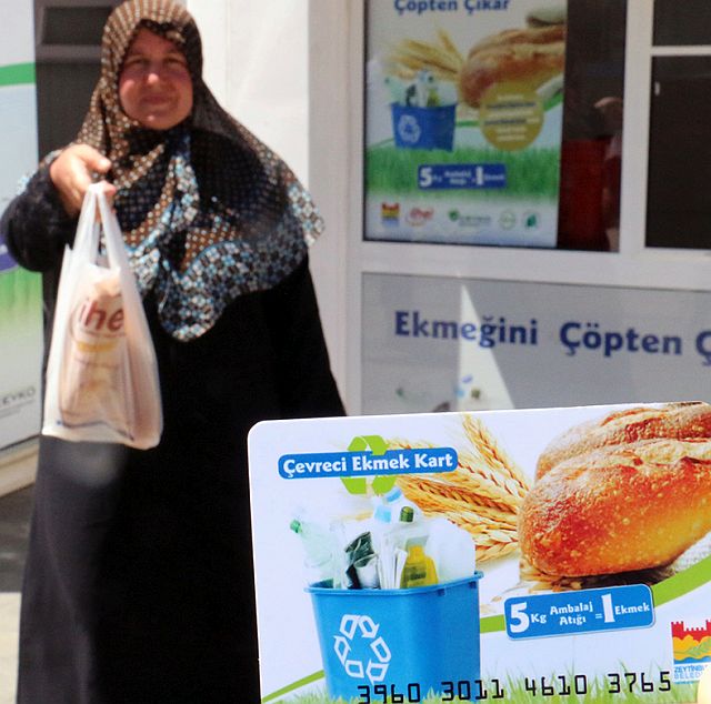 Zeytinburnu’nda yaşayan vatandaşlar, atıklardan ayırdıkları geri dönüşüm malzemeleriyle evlerine ekmek götürüyor. Vatandaşların 175 bin 762 kilo ambalaj atığı topladığı ilçede, biriktirilen atıklar karşılığında Halk Ekmek büfelerinden şu ana kadar 16 bin 757 tane ekmek alındı. Fabrikada türüne göre sınıflandırılan atık maddeler Topkapı Geri Dönüşüm Tesisleri’nde ayrıştırıldıktan sonra Halkalı Kağıt Fabrikası’nda işlenerek kağıt haline getiriliyor.